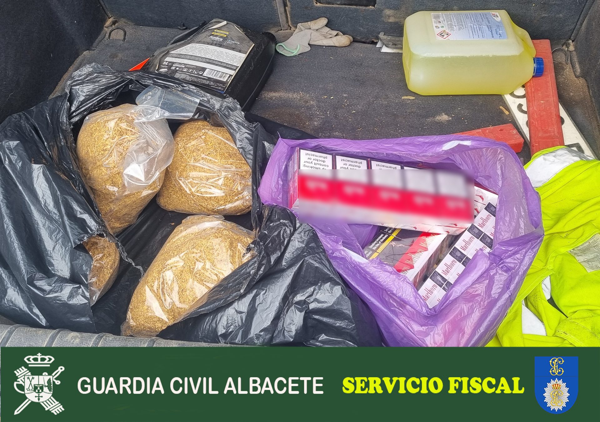 La Guardia Civil de Albacete ha denunciado a un vecino de Hellín tras intervenirle 5 kilos de picadura de tabaco y 50 cajetillas que carecían de las precintas fiscales obligatorias. El material viajaba oculto en el maletero de la furgoneta que conducía y fue descubierto durante un control rutinario de Seguridad Ciudadana.