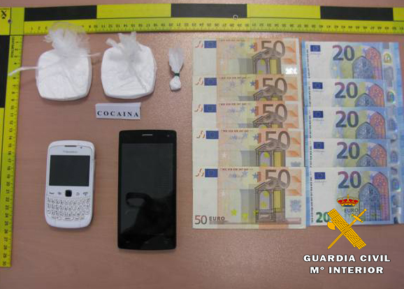 Aparte de los 103 gramos de cocaína, que hubiesen supuesto en el mercado 1.030 dosis, la Guardia Civil intervino el vehículo utilizado para transportar la droga, 350 euros en billetes de diverso valor y dos teléfonos móviles.