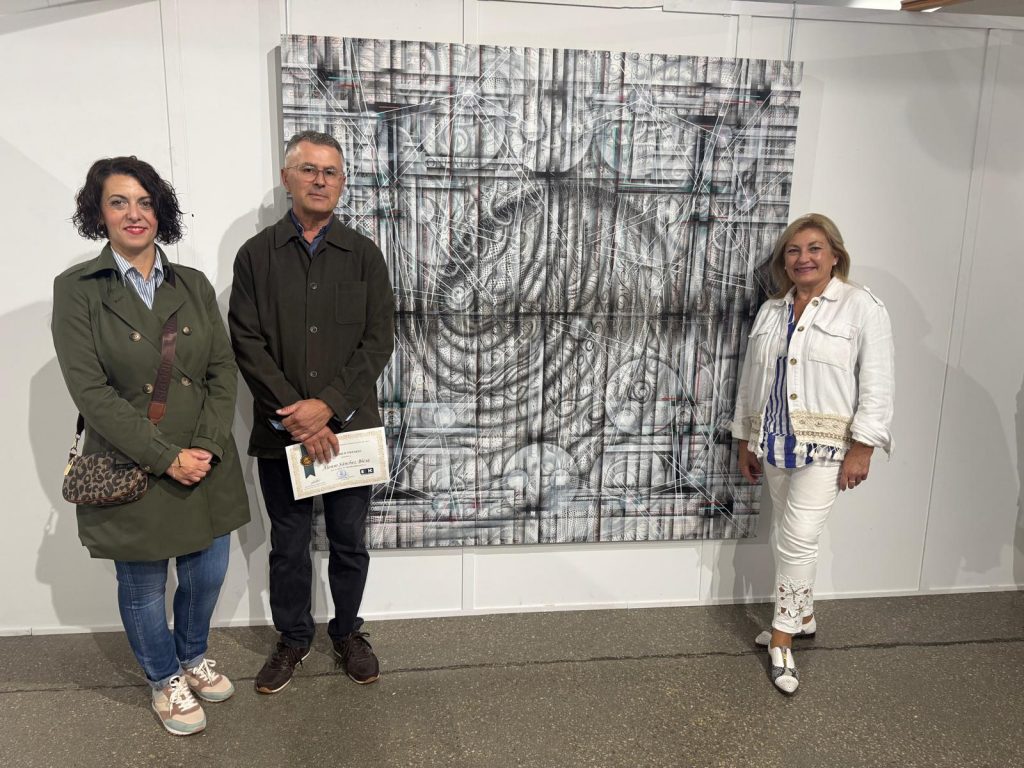 Alonso Sánchez Blesa, licenciado en Historia del Arte por la Universidad de Murcia y con una larga trayectoria de galardones en certámenes nacionales, añadió otro reconocimiento a su extensa lista con la obra ganadora, una pieza de gran formato titulada “P/100.000-ONFÁLICO 2”. Esta composición combina carboncillo, acrílico y óleo sobre tabla, donde formas geométricas y orgánicas se entrelazan para crear un arte vanguardista utilizando técnicas tradicionales.