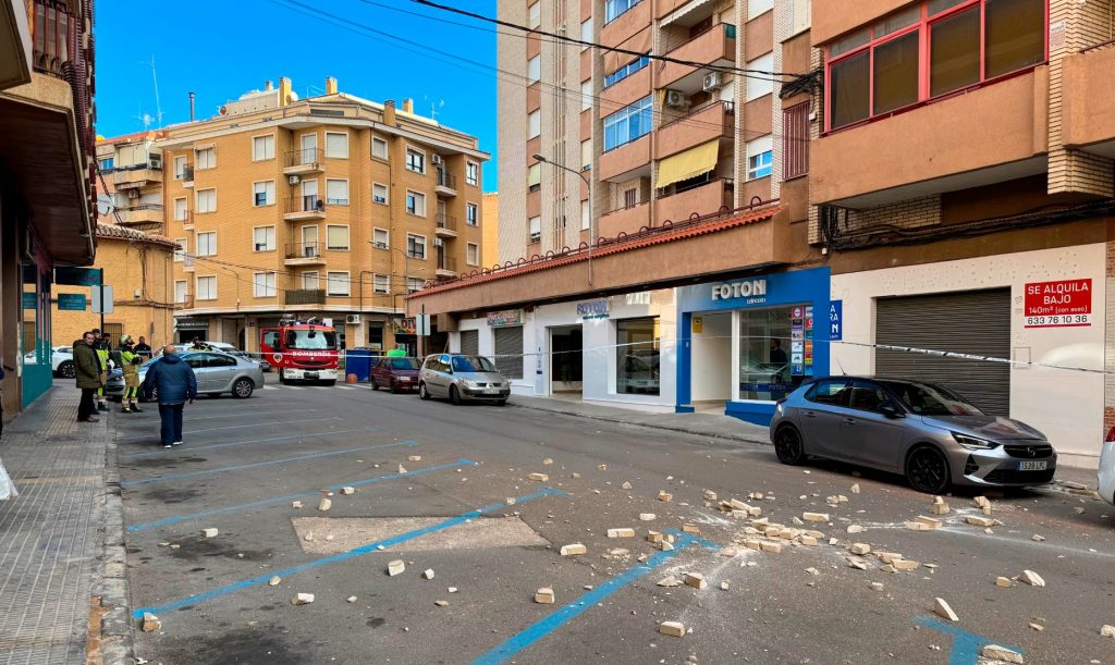 El persistente temporal de viento y lluvia que azota la península en los últimos días ha dejado su marca en la calle Dr. Cerdá Martí de Hellín, donde una fachada ha sufrido significativos desprendimientos en su parte superior, sin causar daños personales.