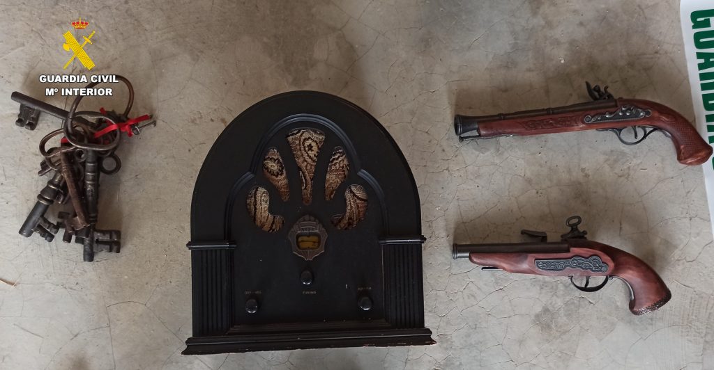 Entre los objetos recuperados se encuentran una máquina de escribir antigua con su caja de madera, un reloj de madera, una radio antigua también fabricada en madera, un juego de llaves de hierro, dos pistolas de avancarga de imitación, un arado, una vertedera antigua y un teléfono de mármol antiguo.