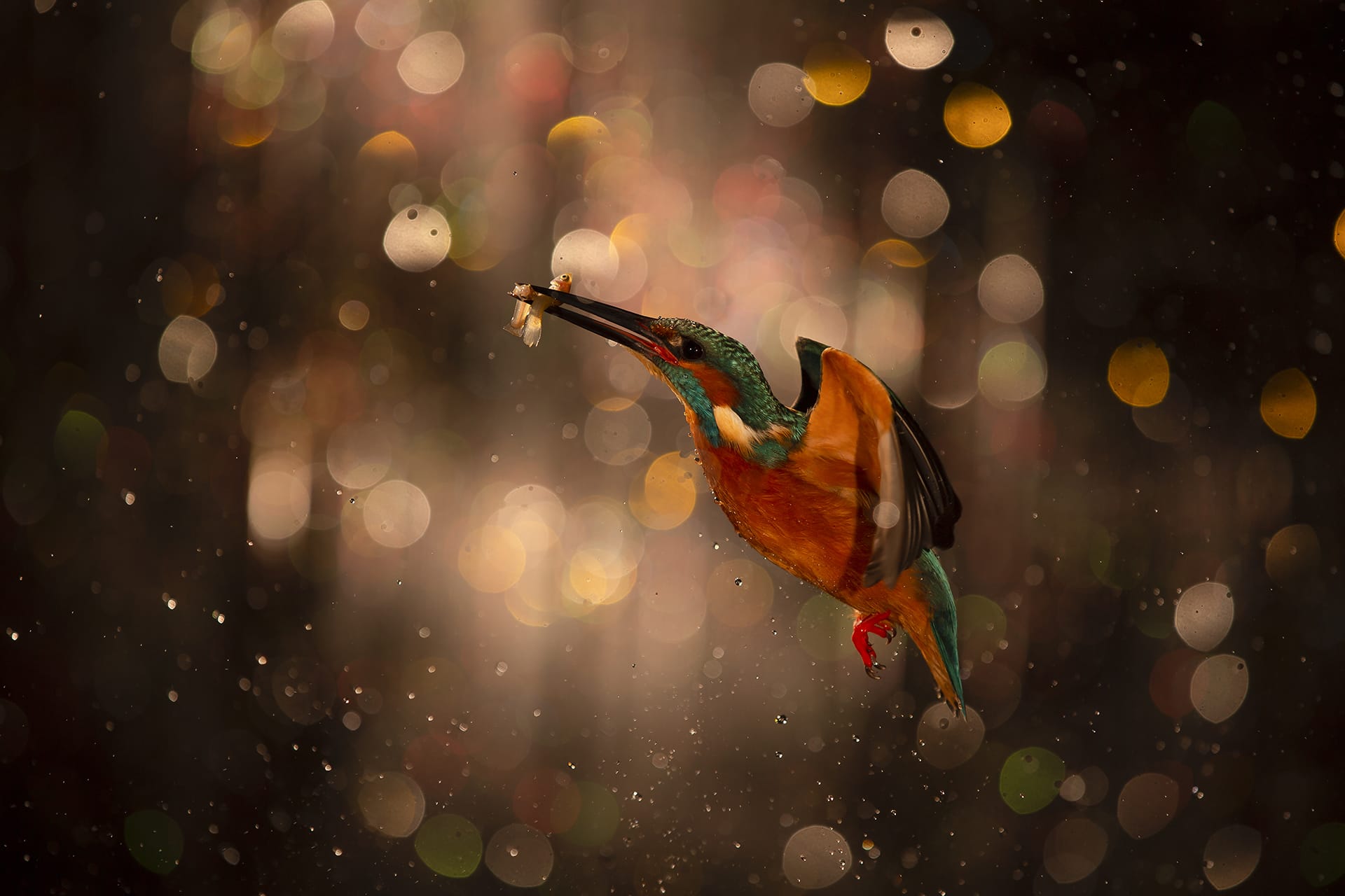 El jurado destacó la dificultad de capturar el rápido vuelo del ave, realzado por el “bokeh” (desenfoque) que crea un efecto visual de múltiples círculos de color, representando diminutas gotas de agua que forman parte del hábitat del ave. La pose del martín pescador, el grafismo del fondo y la calidad técnica de la toma contribuyeron a convertir esta imagen en una obra excepcional.