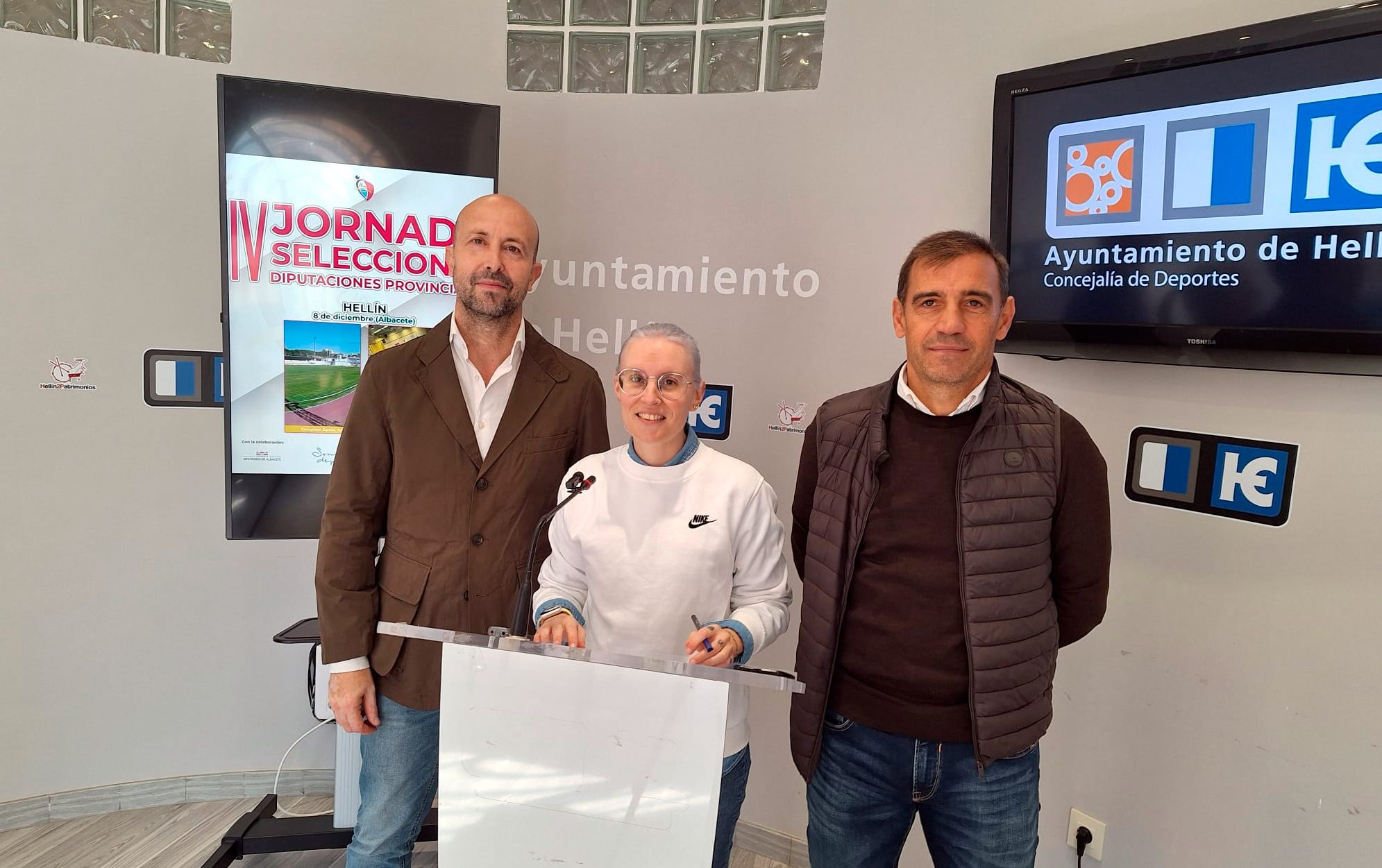 La concejala de Deportes, Miryam Maestre, acompañada por el delegado de la Federación de Fútbol de Castilla-La Mancha, Jorge Zamora, y el director deportivo del Hellín CF, Eloy Jiménez, presentó en la sala de prensa del Ayuntamiento la IV Jornada de la Concentración de Selecciones Provinciales, que se celebrará en Hellín el próximo 8 de diciembre y que reunirá a más de 400 deportistas de categorías alevín, infantil y cadete procedentes de las provincias de Albacete, Ciudad Real, Cuenca y Guadalajara.