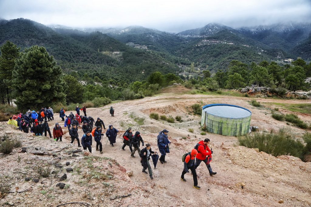 Los siguientes kilómetros eran más suaves y mezclando senda y pista, aunque la lluvia y el viento empezaron a arreciar e incluso había veces que caía aguanieve, pudieron observar que en esta zona extraen la resina de los pinos. Así llegaron a la balsa de “Los Collaillos” fuente abrevadero y lugar donde se sitúa un depósito de agua para la recogida de esta por los helicópteros en caso de incendios.