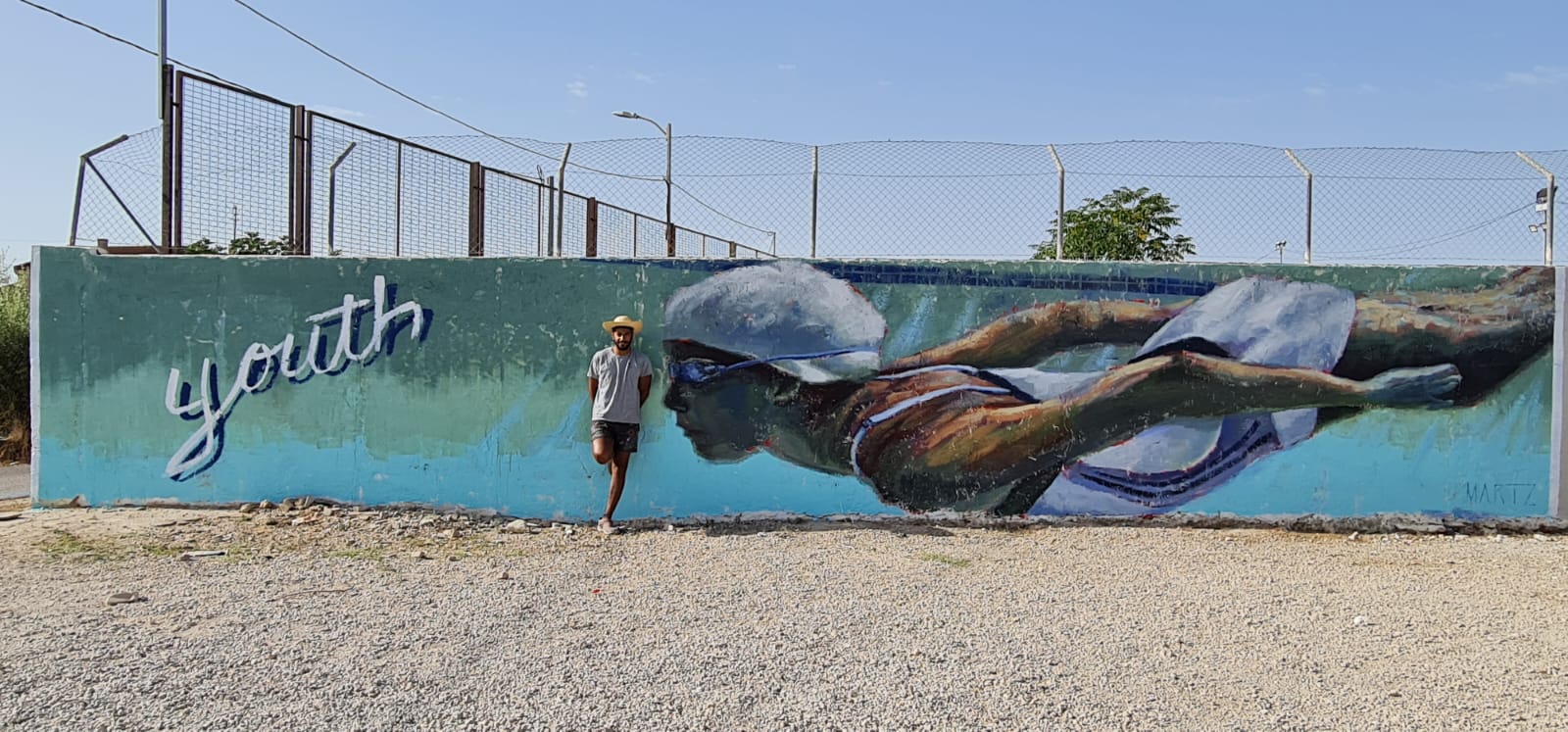 El pasado 21 de julio se reunió el jurado compuesto por miembros expertos en las áreas de Bellas Artes y la docencia para elegir el boceto de Martzel Do Nascimento Goiria, conocido como Martzel, que ha sido el encargado de completar el muro con una obra original e inédita, de unas dimensiones aproximadas de 5 x 2,25 metros, relacionada con el deporte, en la que vemos representada a una joven nadadora que invita al espectador a la práctica del ejercicio físico y, por consiguiente, a la mejora de la salud física y mental, tan importantes hoy día.
