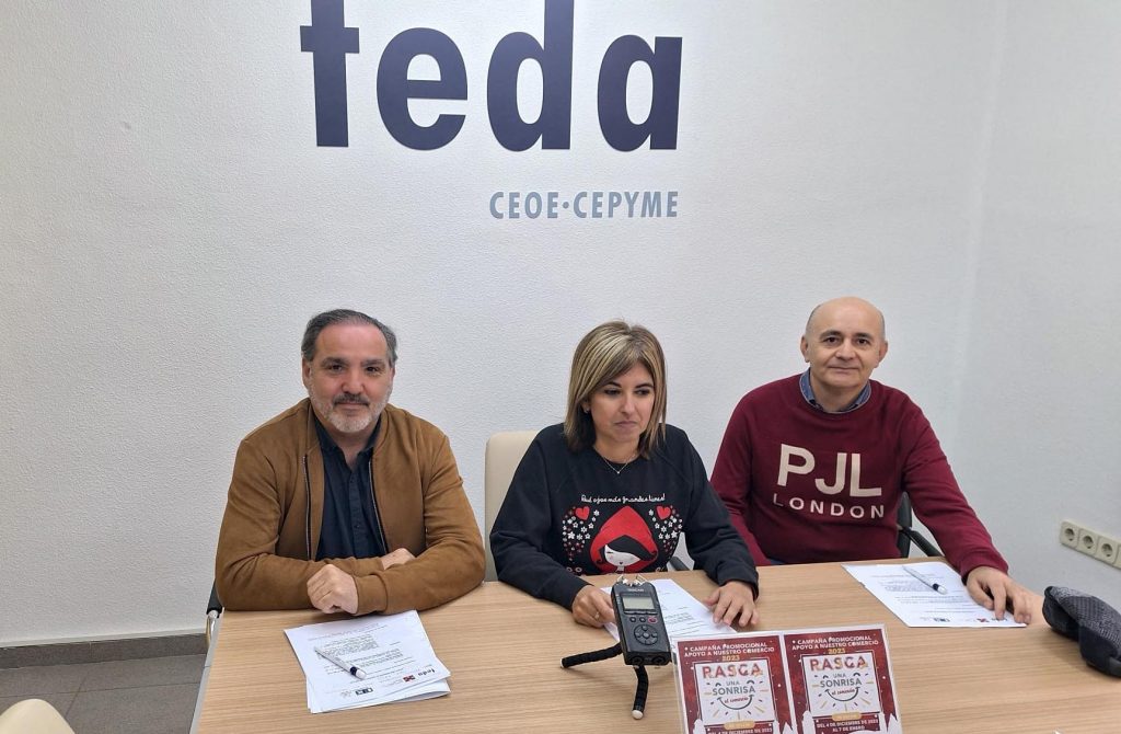 La concejala María Dolores Raez, acompañada de los comerciantes Gregorio Oliva y Miguel Muñoz, llegaron a las instalaciones de FEDA en Hellín para presentar la nueva campaña promocional en apoyo al comercio local durante las próximas fiestas navideñas.