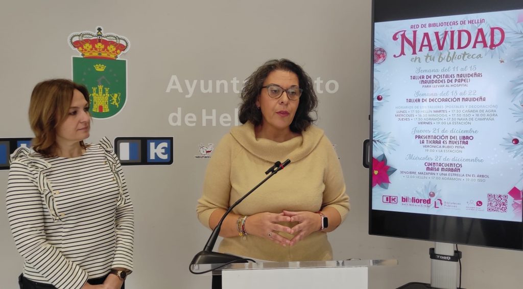 La concejala de Cultura, María Dolores Valencia, acompañada por la integrante de la Red de Bibliotecas de Hellín, Sandra Cánovas, fueron las encargadas de dar a conocer esta programación que se llevará a cabo con motivo de las próximas fiestas navideñas, con el objetivo primordial de fomentar el amor por la lectura y la participación cultural.