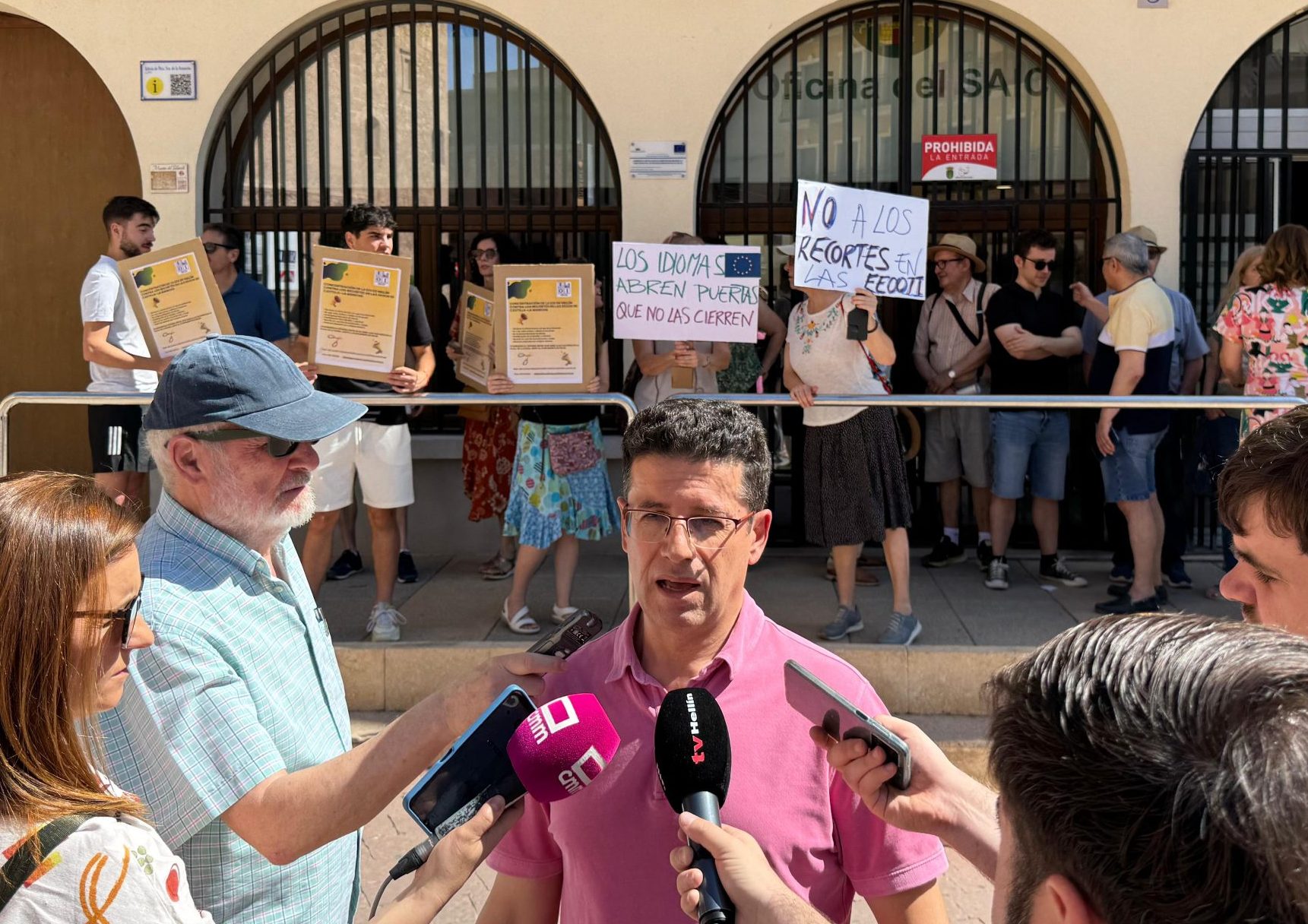 Alrededor de 30 personas se dieron cita este jueves frente al Ayuntamiento de Hellín para manifestarse en defensa de la Escuela Oficial de Idiomas “Conde de Floridablanca” y contra los recortes que amenazan su oferta educativa para el curso 2025/2026. Entre los asistentes se encontraban los concejales Pedro García Sequero y Dolores Valencia, en una protesta convocada por delegados de curso y respaldada por el equipo docente del centro.