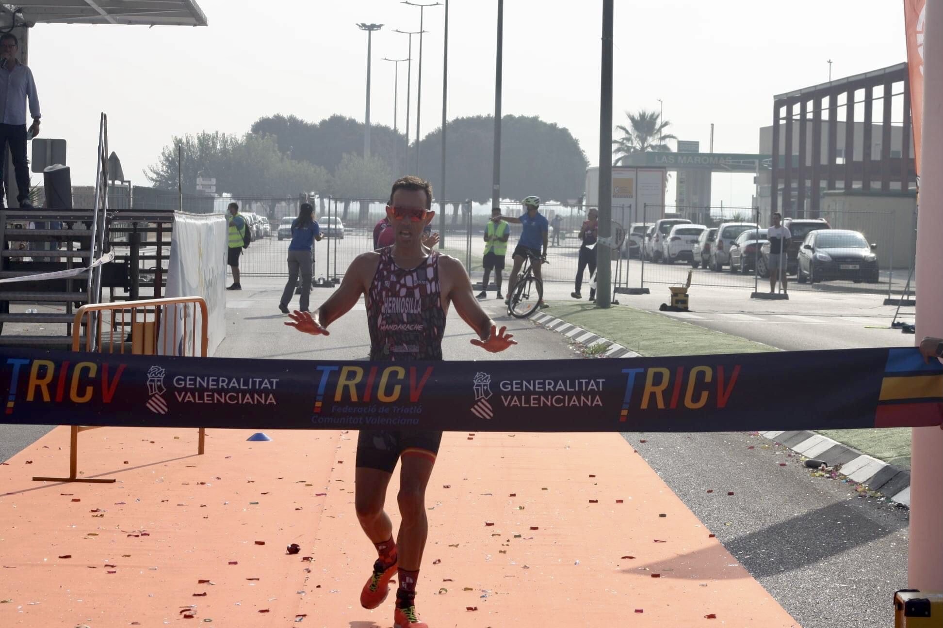 En la última transición, Hermosilla, en un fenomenal esfuerzo, imponiendo un ritmo de carrera de 3:12km, quedó solo en la carrera para así cruzar la meta en solitario y conseguir una importante victoria, que dedicó en la llegada a su padre que le acompaño ese día.