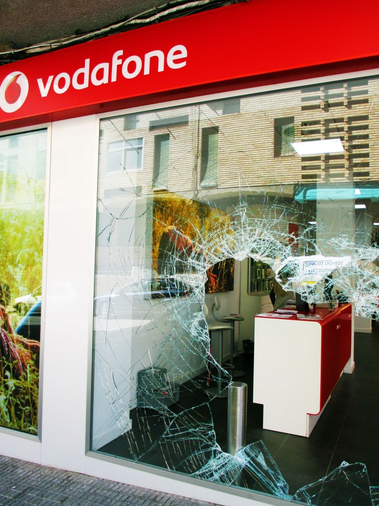El segundo robo en la misma zona, pero en la otra acera, ocurrió en una tienda de telefonía Vodafone, donde el método fue totalmente distinto y bastante más primitivo.