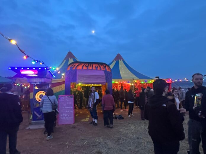 La llegada al enclave fue un contraste absoluto. En la explanada próxima a la aldea abandonada de Alcantarilla, decenas de equipos de sonido levantaban auténticos muros de altavoces. Gente llegada de distintos puntos de España y de otros países bailaba al aire libre, ajena al barro del acceso y a los controles del camino. Con el atardecer, las luces de neón y los focos transformaron el lugar en un escenario irreal, aislado del resto del mundo.